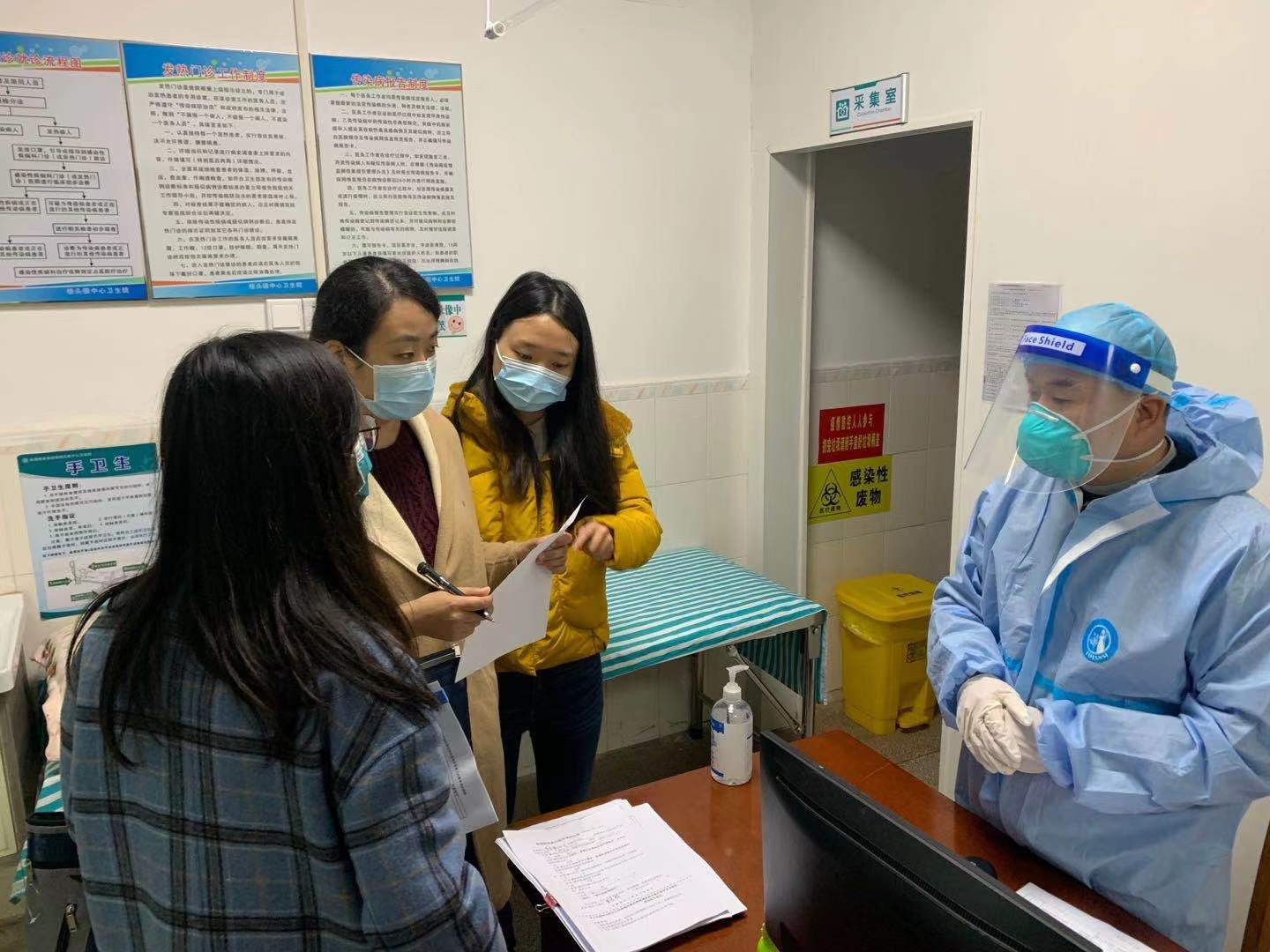 廖羽(左二)于乳源县乡镇卫生院检查指导发热门诊工作