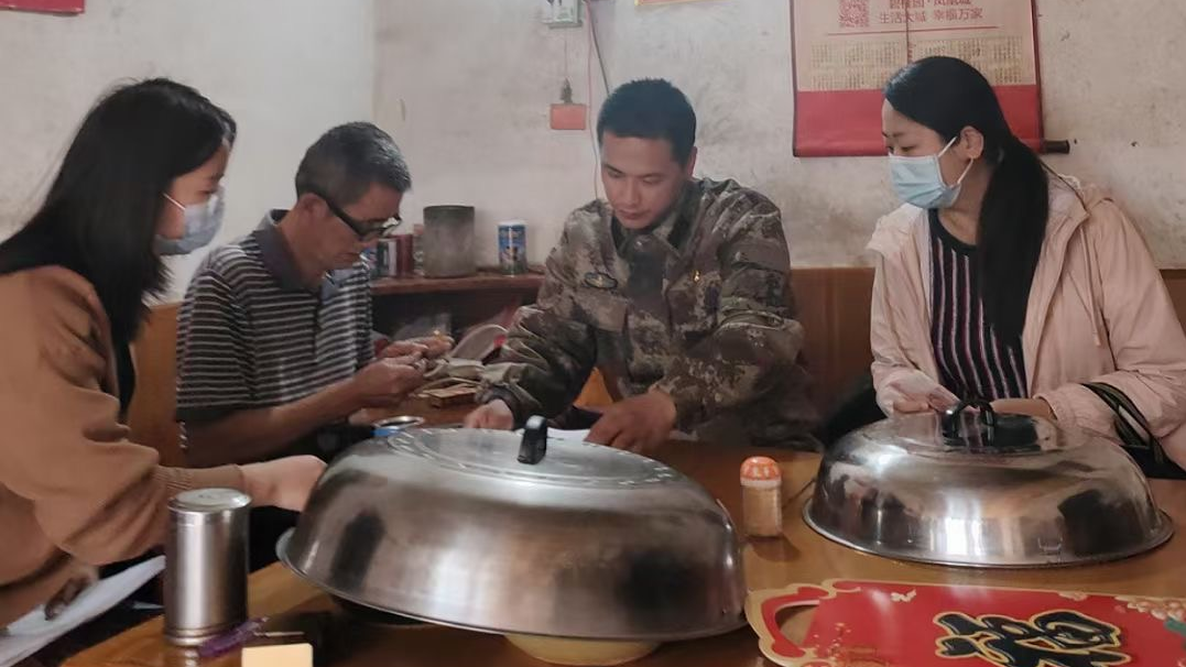 廖羽(右一)走访村民入户了解情况