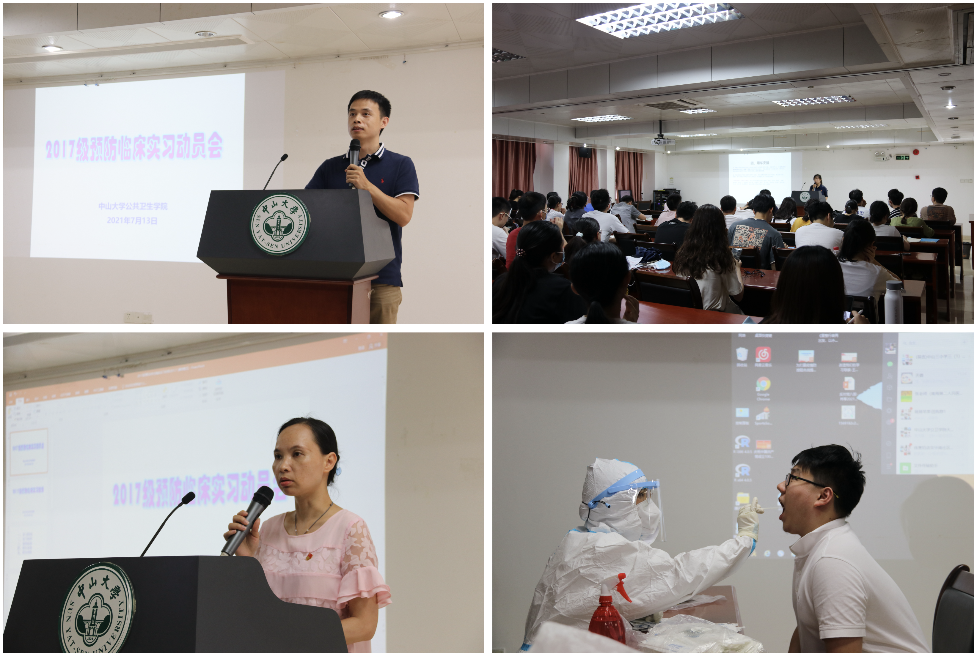 会上,简玲玲老师首先向同学们传达了《公共卫生学院关于2017级预防医学专业学生赴医院临床实习的通知》,从时间安排、实习报到、转科设置、考核方法等方面进行了详细讲解。刘跃伟副教授结合自身经历,叮嘱同学们珍惜此次临床实践机会,在实习期间遵守学校和医院的各项相关管理规定,规范请假流程,注意人身安全。最后,王燕芳副书记做实习动员,从学科发展角度强调了临床实习的重要性和实践价值,号召同学们在实习单位充分展现中大公卫人严谨的学习态度和积极向上的精神风貌,同时要求同学们虚心求教、敢于担当,努力为以后的求学深造打下扎实的基础。动员会结束后,学院根据学校防疫工作要求,组织全体同学在现场进行了核酸检测。
