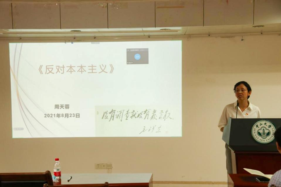 周天蓉支部书记以《反对本本主义》这篇文章为例,分享了对继续推进马克思主义中国化的学习体会,她讲解了文章中“没有调查,就没有发言权”、“调查就是解决问题”、“反对本本主义”、“调查的技术”等重点内容,分析文章的实践价值,告诉学生党员在学习工作中调查研究是解决实际问题的方法论,也是每个人学习工作的基本功,进而鼓励学生党员要争做沟通、表达、知识、技能全面发展的综合人才。