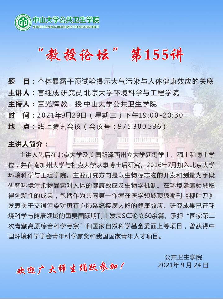 "教授论坛“155讲——个体暴露干预试验揭示大气污染与人体健康效应的关联