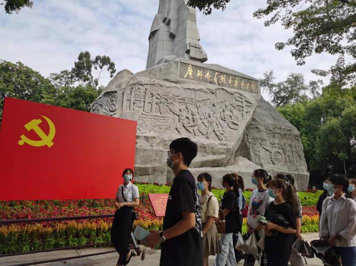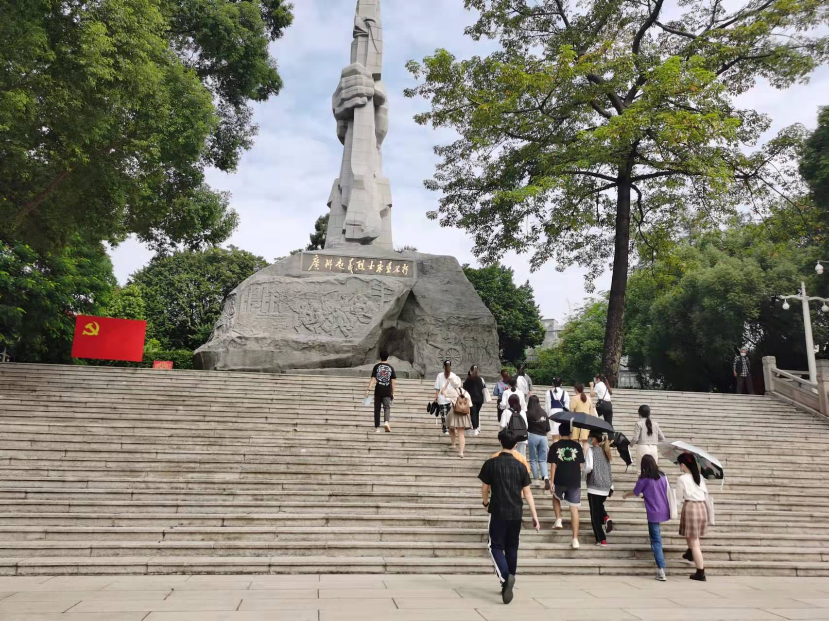 早上十点,三班的同学们早已在北校园学一饭堂门口前列队集合,集体步行前往广州起义烈士陵园。来到烈士陵园正门前,映入眼帘的是庄严肃穆的红门和直冲云霄的石雕。同学们列队有序的配合工作人员查看健康码并测量体温,由讲解员带领大家进入陵园。