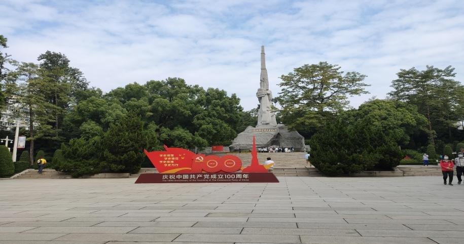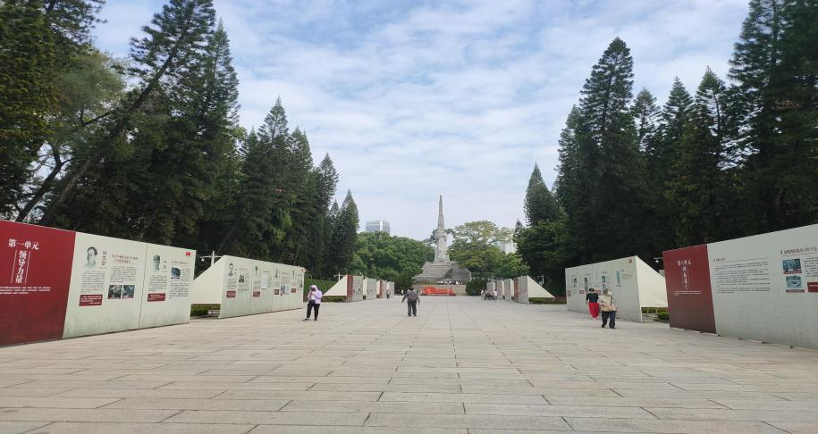 烈士陵园入门便是一片红色,大门是根据中华人民共和国国旗来制作的,整体是红色,并用金黄色点缀,门一开,就像是五星红旗在迎风飘扬。正值党建立100周年,烈士陵园也开展了“革命人永远年轻”的英烈主题展,广州起义中的无数英雄人物的一生让大家铭记学习。张太雷、叶剑英、叶挺等革命先驱在风华正茂之际将一生奉献给革命事业,心中不禁涌起一股敬佩之情。走在宽广的陵区大道上,大道两边竖立着烈士们的介绍板和一个爱心留言板。留言板上贴满了密密麻麻的爱心便利贴,表达了后辈们对先烈的敬爱、敬仰和敬畏。