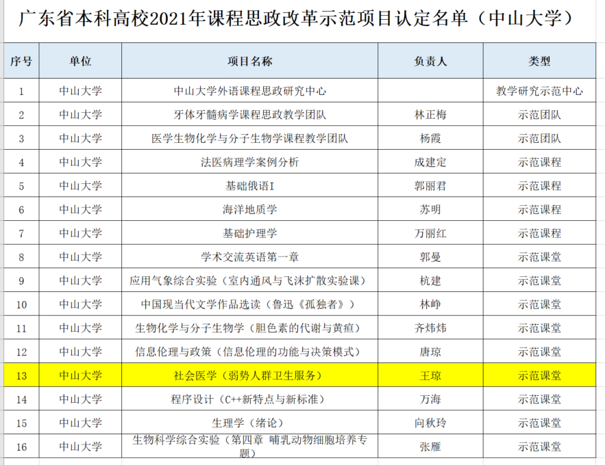 近日,广东省教育厅发布《广东省教育厅关于公布2021年度本科高校课程思政改革示范项目认定名单的通知》(粤教高函〔2021〕21号),我院王琼副教授设计的《社会医学(弱势人群卫生服务)》获得认定,成为2021年广东省本科高校课程思政改革示范课堂,本次我校获认定示范课堂共计9个。