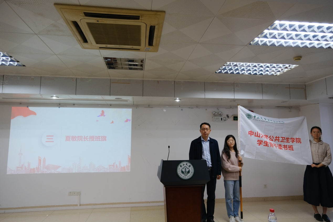 随后,夏敏院长为首期学生骨干读书班授班旗。