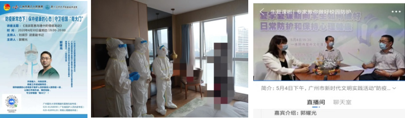 2020年初武汉疫情风起云涌,新冠肺住院患者及医务人员在共同对抗疫情的过程中,也饱受了疫情所致的心理冲击。为了更好地帮助患者和医务人员调整好心理状态抗击疫情,郭耀光作为广东省援鄂医疗队的一员前往武汉市汉口医院开展心理援助工作。援鄂期间,所在的汉口医院组(共5人)对汉口医院门诊楼4楼的清洁区进行改造,建立了医务人员放松减压的心理驿站;每天上午结束心理驿站的工作后,会根据获得的联络会诊及心理援助需求信息,中午穿戴防护装备进入呼1区至呼7区各病区的病房内开展联络会诊及心理巡房,对出现了心身症状的新冠肺炎患者进行心理干预。援鄂返穗后,针对疫情期间发现的各类受到影响的群体,郭耀光积极参与各类心理干预手册的编写宣传,为全市中小学师生、医务人员、癌症患者等讲授心理科普讲座,并承担了广州市心理危机干预的培训和干预工作,多次紧急出动从事全市自伤自杀等危机事件的心理干预,以及疫情隔离人员心理干预工作。