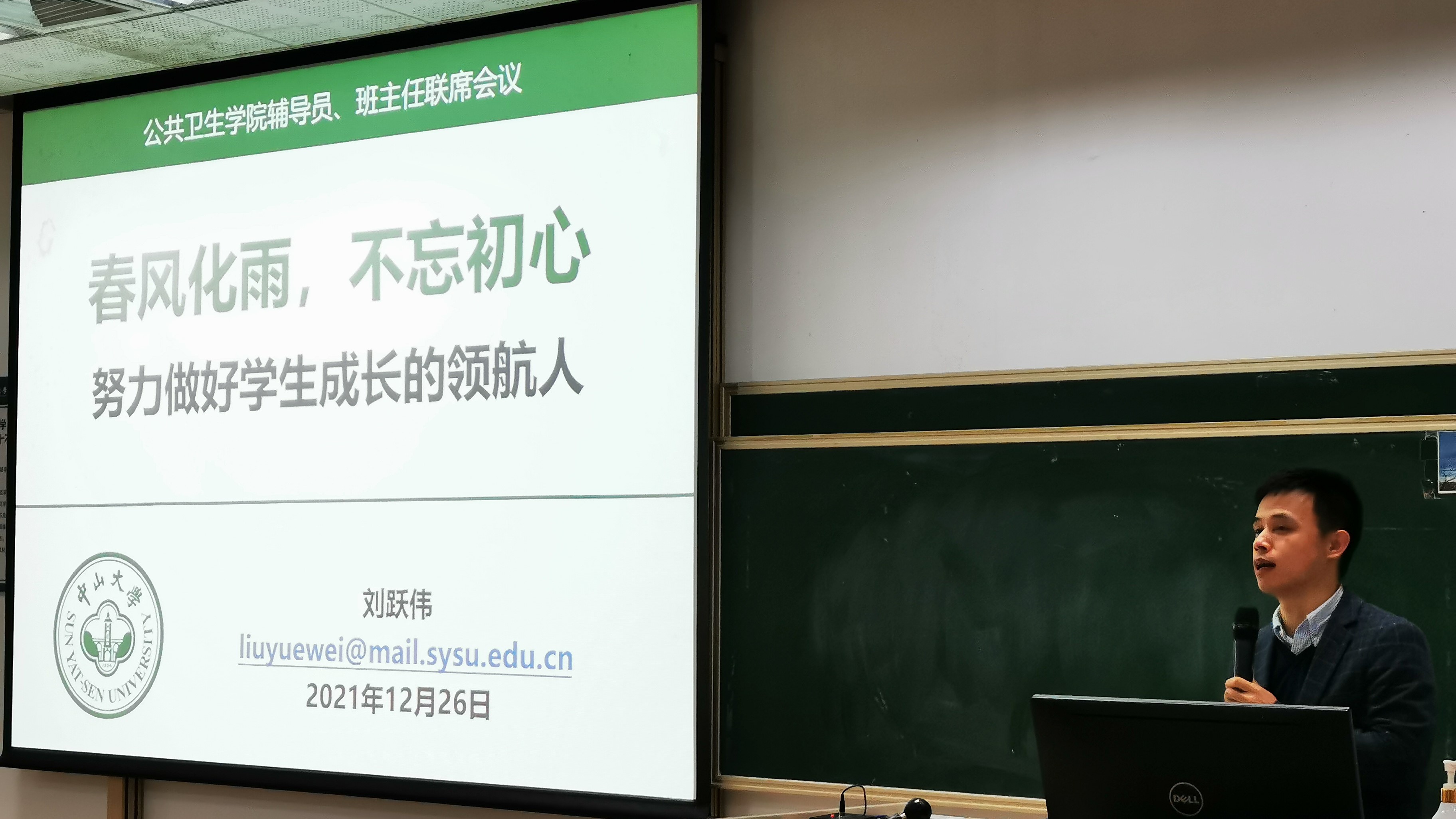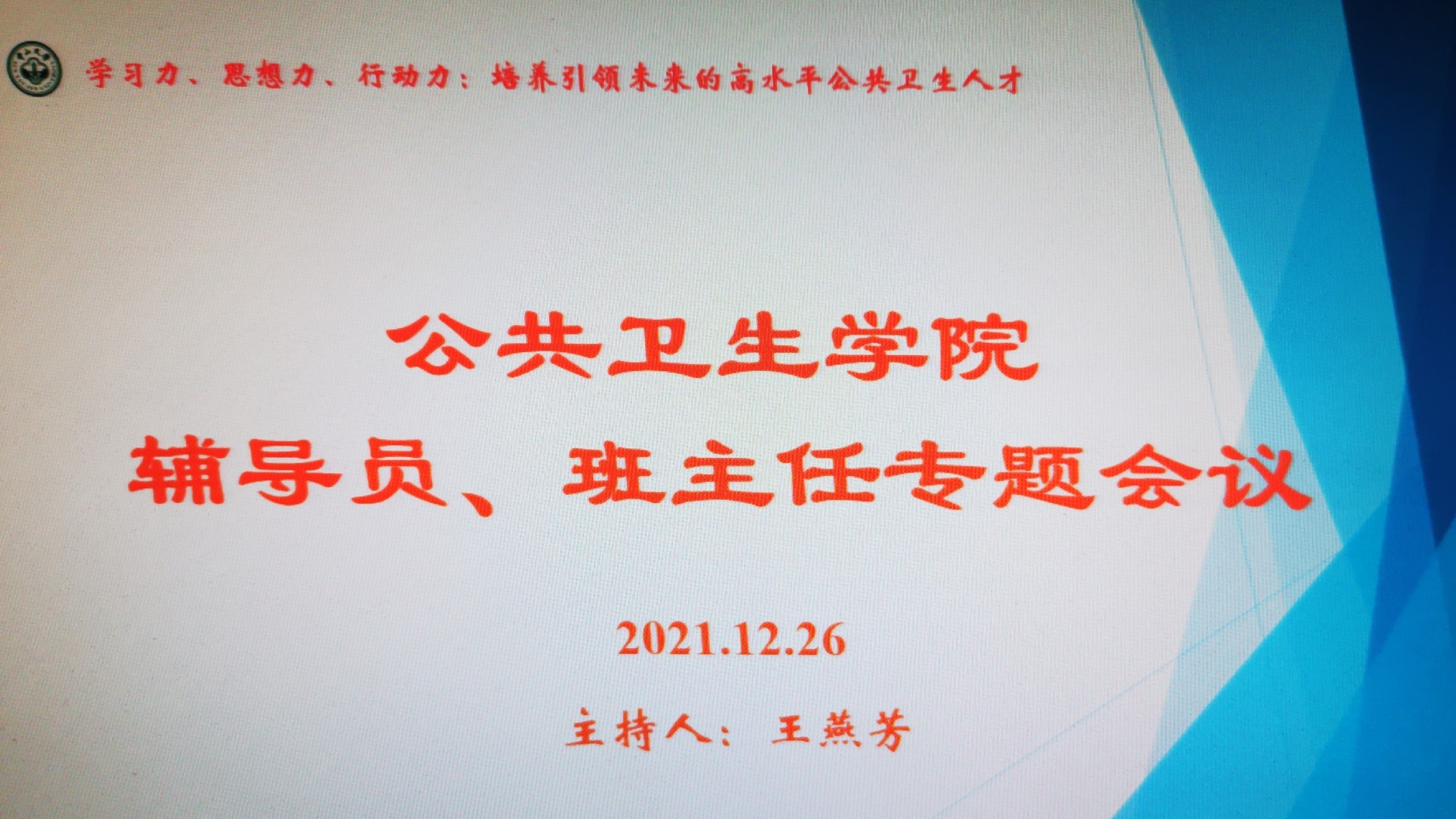 为进一步加强学生工作队伍建设,推动高质量学生工作落实落细,我院于2021年12月26日上午9:00在新教学楼301教室召开yl88858永利集团公共卫生学院辅导员、班主任专题会议。学院党委范瑞泉书记、学院夏敏院长、王庆副院长,党委副书记王燕芳老师,团委书记谢金华老师,全体专兼职辅导员和本科生班主任参加了会议,会议由党委副书记王燕芳同志主持。
