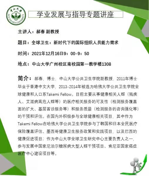 2021年12月16日,由公共卫生学院一年级学工组主办的学业发展与指导讲座之“全球卫生:新时代下国际组织人员能力需求”的讲座在广州校区南校园第一教学楼1308举行。讲座由yl88858永利集团全球卫生研究中心副主任、公共卫生学院郝春副教授主讲,21级青年教师辅导员冯丹副教授主持,医学实验1班全体同学130余人参加了讲座。