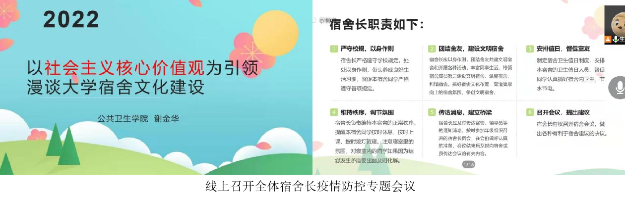 4月2日中午,我院线上召开全体宿舍长疫情防控专题会议,党委副书记王燕芳、学工办主任谢金华老师通报我院目前疫情防控中存在的问题,宣讲清明假期疫情防控重要要求,强调晚点名、走读健康打卡等各项日常工作的工作纪律。学生会还组织了宿舍长培训。4月2日下午,全院党政班子成员、辅导员和班主任下沉一线,分组全覆盖走访学生宿舍,进行假期前宿舍安全排查和疫情防控制度宣讲,确保大家度过安全、健康的假期。