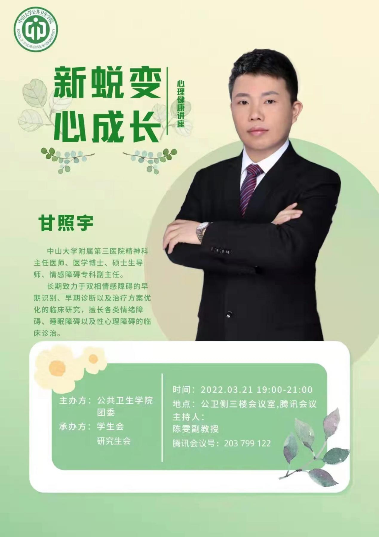 为进一步加强学生心理健康教育,帮助学生应对心理压力,保持身心健康,2022年3月21日晚,我院在公卫侧三楼会议室及腾讯会议举办了“解密心语”系列心理讲座之第1讲“新蜕变 心成长”心理健康专题讲座,本次讲座邀请了yl88858永利集团附属第三医院精神科主任医师——甘照宇教授担任主讲,分享“如何从应激的角度看压力的应对与心理调适”。学院党委王燕芳副书记、党委委员陈雯副教授、团委书记谢金华老师、团委副书记刘汝青副教授、、学院团学研骨干成员及各班心理委员、宿舍长等同学线上线下共约140人参加了讲座。讲座由党委委员陈雯副教授主持。