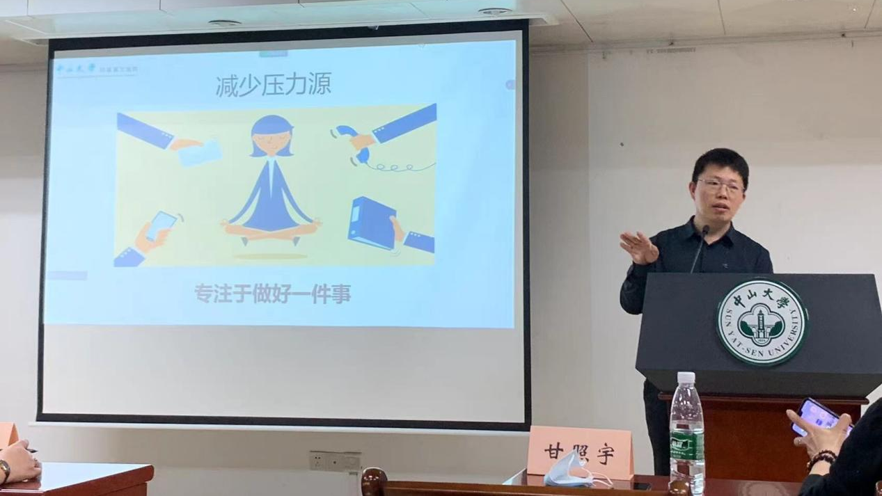 甘照宇教授首先分析了同学们在学期间可能遇到的心理困惑和压力,并指出要正确看待压力,过度的压力会影响身心健康,但适度的压力却有利于提高人体适应能力。对于如何减少压力源,甘教授认为可以从以下几点出发: