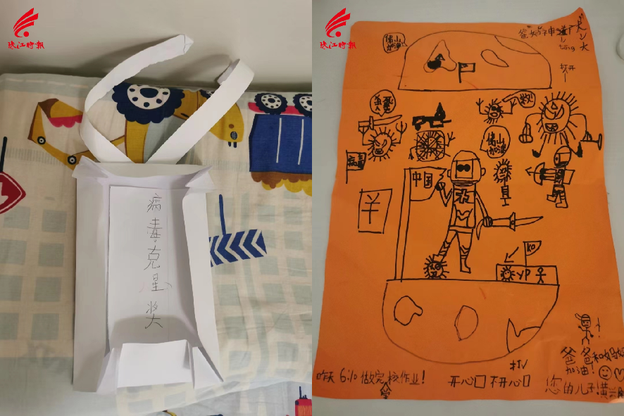左:女儿制作手工作品送给妈妈;右:儿子的绘画作品