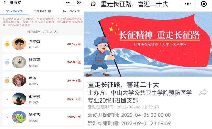 2020级1班团支部活动分线上、线下两部分。线上开展“重走长征路,喜迎二十大”云上健步走活动,在鼓励大家健康适度运动的同时,号召青年同志坚定理想信念,践行初心使命,弘扬长征精神;线下开展分组比赛形式的党史知识竞答,充分调动了同学们的积极性。此外,支部活动还将党史知识与趣味游戏“谁是卧底”“你画我猜”相结合,让同学们在游戏中加深对党史知识的印象。活动现场欢声笑语、气氛热烈,活动结束后同学们纷纷表示有所收获。