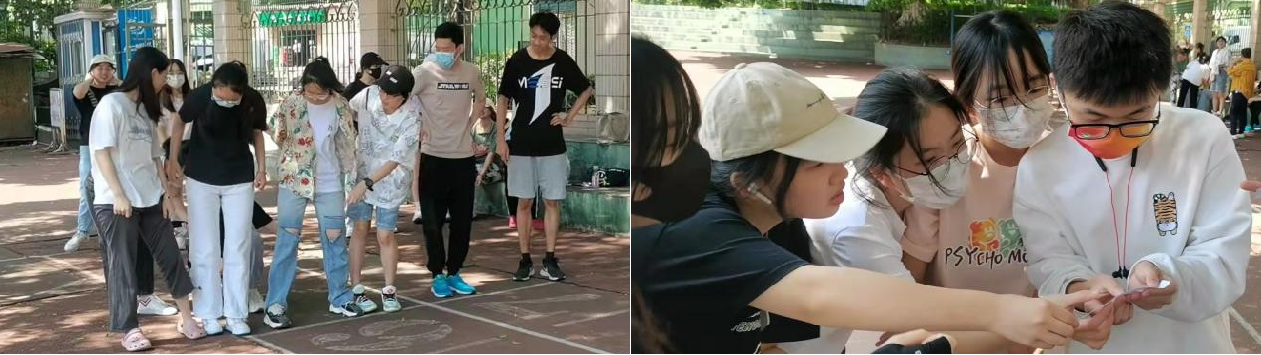 本次定向越野准备了“两人三足”、“双人跳绳”、“摸石过河”三个锻炼项目,每个项目要求各小组成员在到达终点后回答党史知识题目,答对后方可进入下一项,最后完成三项运动用时最短的小组即可获得奖励。