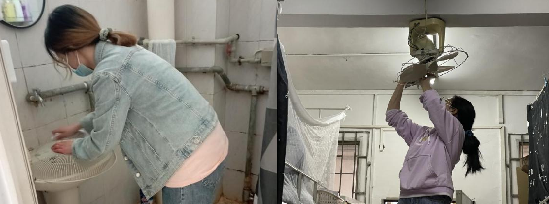 正值清明节,刚下过一场春雨,广州的夏天即将到来,然而学生宿舍的风扇已经积尘许久,使用起来有飞尘,不利于呼吸道的健康。为了让同学们能够使用上健康清洁的风扇,公共卫生学院本科生党支部于2022年4月3日至4日举办了一年一度的“送清凉”活动。支部的党员、发展对象、入党积极分子纷纷踊跃报名参加,带着从学校物业工程部借来的梯子和购买的清洁剂、抹布,去到同学们的宿舍,亲自为学院同学们宿舍的风扇进行了一次大清洗。