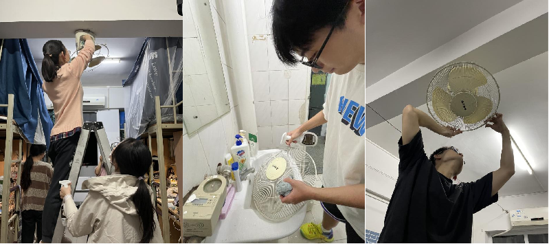 本次活动在北校园进行。经过前期策划准备,服务从4月3日下午开始,持续到4月4日晚上结束,支部志愿者人数达66人,服务学生宿舍达37间。支部事先对志愿者们进行安全教育和服务培训,通过相关资料学习如何拆卸、清洗、安装风扇外壳,往年参加过该活动的支部成员也把实践经验分享给其他成员。活动过程中,志愿者们2或3人一组,提前联络宿舍长,到达学生宿舍后,先确保风扇已经断电,随后一人爬上梯子拆卸、安装风扇外壳,另一人扶住梯子、清洗风扇外壳,保护同伴的安全。在科学合理的分工和安全有效的行动下,志愿者们高效地完成了风扇的清洗任务,赢得了同学们的一致好评。