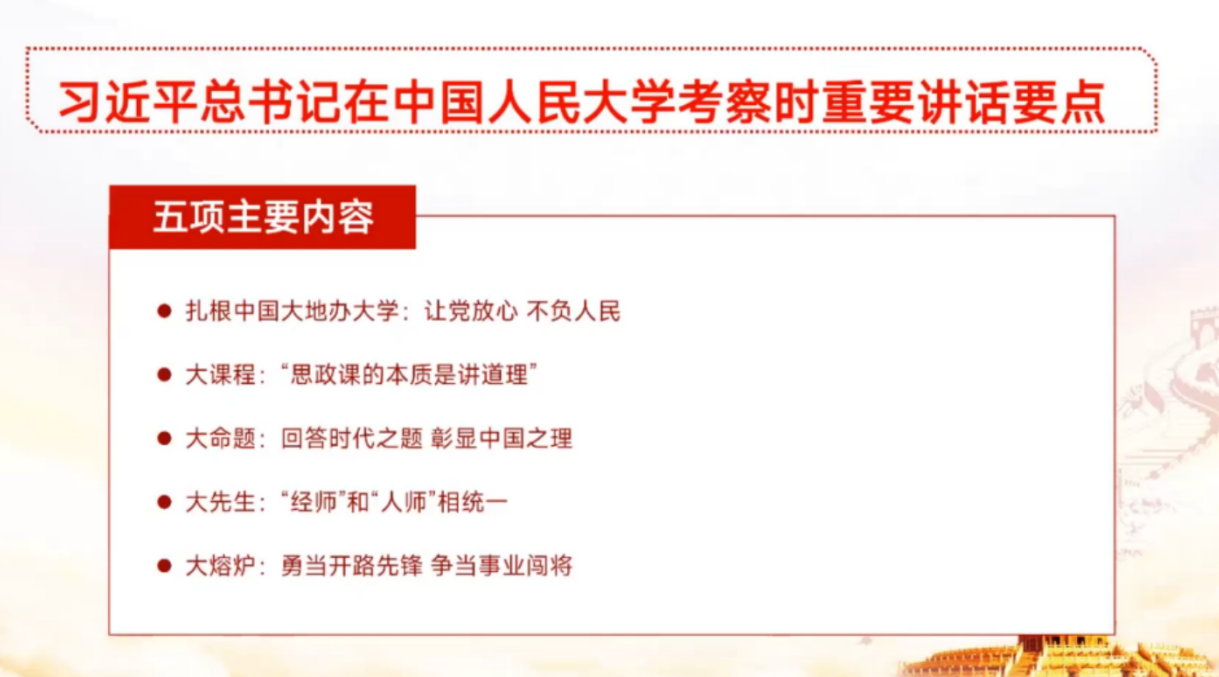 会议一开始,首先完整播放了习近平总书记4月25日考察中国人民大学的新闻报道,随后学院团委书记谢金华老师带领大家学习了习近平总书记的重要讲话精神。习近平总书记在讲话中强调:要扎根中国大地办大学,做到让党放心、不负人民;高校要办好大课程,思政课的本质是讲道理;思政课要解答好大命题,回答时代之题,彰显中国之理;教师要做好大先生,做到“经师”与“人师”相统一;学生要投身社会大熔炉,勇当时代先锋,争当事业闯将。