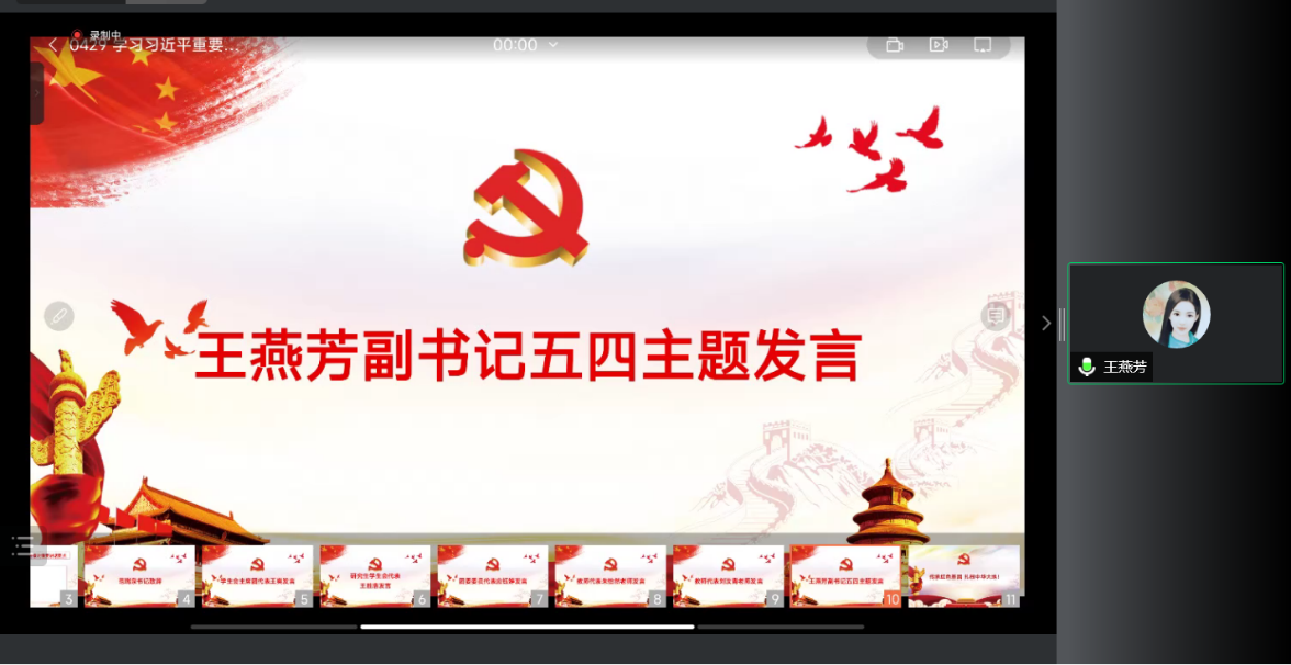 学院党委王燕芳副书记对本次分享会进行了总结。她指出“五四精神”是爱国、进步、民主、科学,其核心是爱国主义,爱国主义是立身之本、成才之基。弘扬爱国主义精神,首先要学史读典,培养爱国情怀;其次要发奋图强,立强国之志,立志为公共卫生事业发展而奋斗不息;第三,应当引领示范,行报国之事,用实际行动行强国之路。公卫学子应青春向党,不负人民,到祖国需要的地方去,积极投身于实践中,奋发拼搏,展现才华,把自己培养成德智体美劳全面发展的接班人。最后,王老师提醒同学们在“五一”假期要带头遵守防疫规定,祝同学们五一假期快乐、五四青年节快乐!
