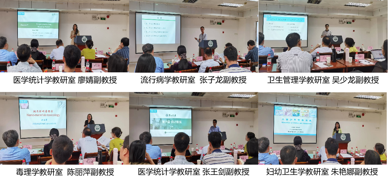 医学统计学教研室廖婧副教授和张王剑副教授、流行病学教研室张子龙副教授、卫生管理学教研室吴少龙副教授、毒理学教研室陈丽萍副教授、妇幼卫生学教研室朱艳娜副教授分别参加了医科组、通识(公选组)课和全英组三个组别的比赛。比赛特邀国家教学名师方积乾教授,院级教学督导何云教授、徐琳教授,学院劳环卫教研室肖勇梅教授、妇幼卫生学教研室陈亚军教授担任专家评委;来自学院各专业的10名学生代表担任学生评委。