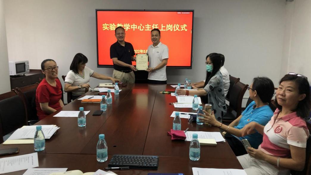 2022年5月20日上午,在公共卫生学院侧四楼应急演练室举行了实验教学中心主任上岗仪式,学院党委范瑞泉书记、董光辉副院长、学院办公室周天蓉主任和中心全体人员参加。上岗仪式由实验教学中心副主任侯孟君主持。