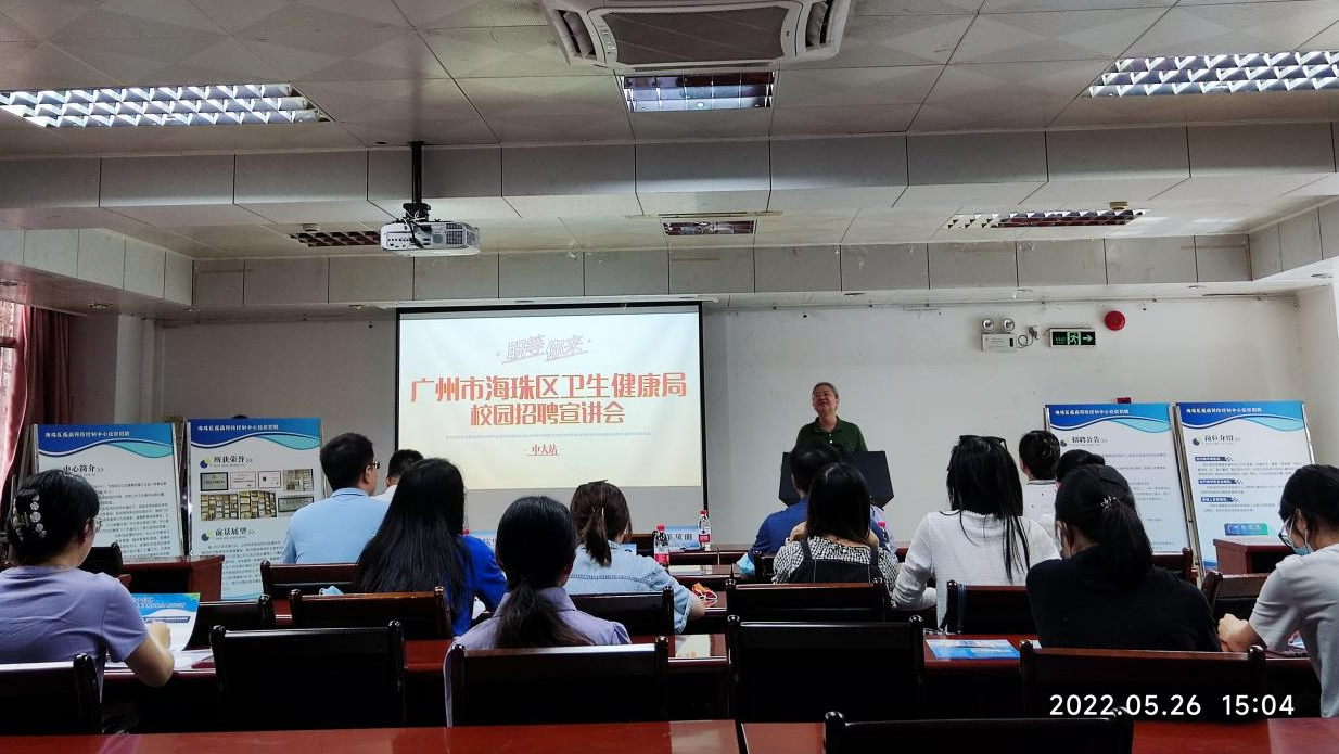 为进一步提高学生就业质量,做好毕业生就业服务。我院邀请海珠区卫生健康局到校进行招聘宣讲和座谈交流。2022年5月26日,海珠区卫生健康局董延明局长带队一行6人到我院进行招聘交流,我院30余名2022届本科生、研究生参加了招聘会。宣讲会由学院学工办主任谢金华主持。