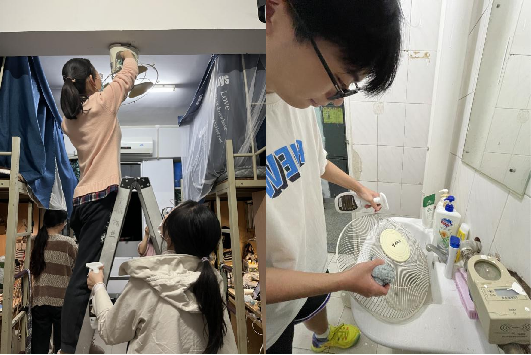 本次活动在北校园进行。活动前,志愿者们事先学习如何拆卸、清洗、安装风扇外壳。活动过程中,志愿者们2或3人一组,提前联络宿舍长,到达学生宿舍后,先确保风扇已经断电,随后一人爬上梯子拆卸、安装风扇外壳,另一人扶住梯子、清洗风扇外壳,保护同伴的安全。在科学合理的分工和安全有效的行动下,志愿者们高效地完成了风扇的清洗任务。本次“送清凉”活动旨在营造清洁健康的宿舍环境,帮助同学们更好地投入到学习和生活中去,为同学们带去了夏日的第一抹清凉、第一声问候。