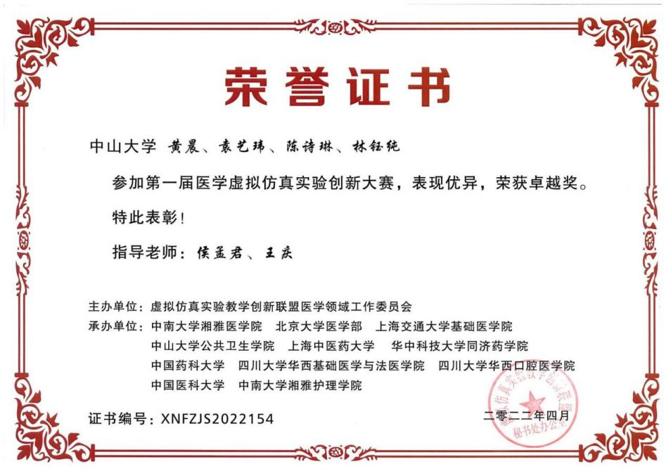 在学院党委、实验教学中心、学术与教务工作办公室和学生工作办公室的精心组织下,我院2018级本科生黄晨、陈诗琳,2019级林钰纯和人工智能学院2020级本科生袁艺玮组队参加全国第一届医学虚拟仿真实验创新大赛,从202支参赛队伍中脱颖而出,荣获卓越奖和网络人气-暖心人文奖。