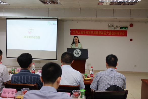 会议伊始,王燕芳副书记致辞,表示举办健康科普大赛意义重大,是响应党中央“健康中国2030”号召,大力宣传普及《“健康中国2030”规划纲要》,引导人民群众强化健康意识,增强健康理念,养成健康生活方式,同时也是引导公卫学子提升专业兴趣,将所学知识运用到实践并提升健康教育、健康促进的基本技能的重要途径,从2019年起由学院学工办牵头组织,守护健康协会承办,举办了三届健康科普大赛,推荐的优秀参赛作品多次获全国和全省健康科普大赛的一等奖等荣誉, 展现了我院优秀的人才培养质量以及公卫学子“积极参与健康科普,守卫人民健康”的精神风貌。