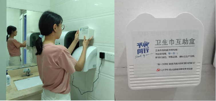 公共卫生学院儿少卫生与妇幼保健学研究生党支部于2022年6月7日开展了关爱女性的“予她同行,传递温暖”卫生巾互助盒暨“爱心先锋,健康妇幼”系列活动。活动贯彻“为人民服务”宗旨,通过在洗手间设置卫生巾互助盒提供应急卫生巾的方式,帮助经期有紧急需求的女性;同时鼓励女性捐献卫生巾,取一放一,互帮互助。