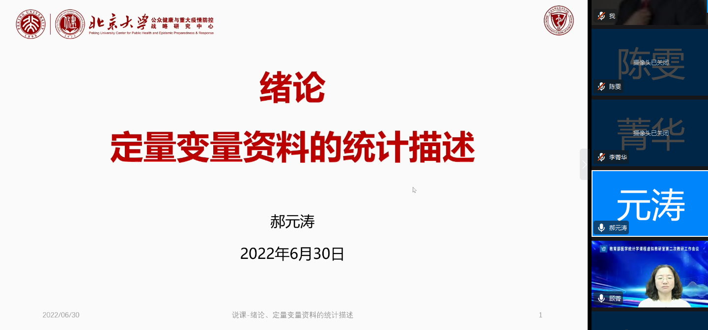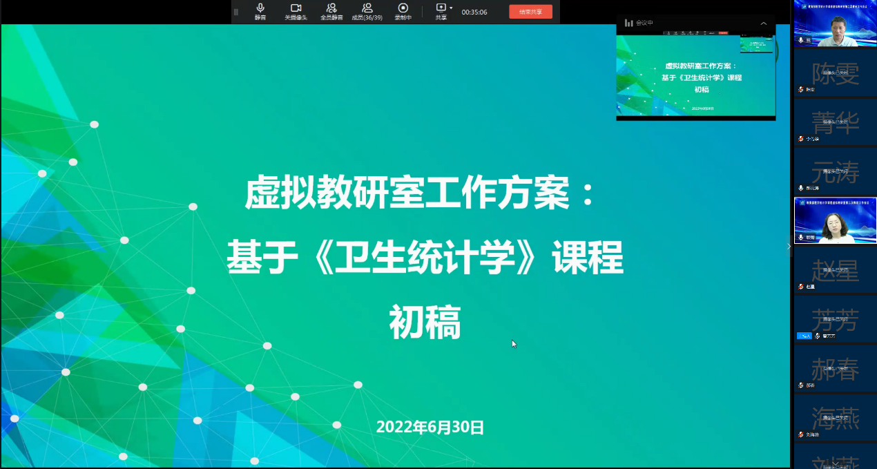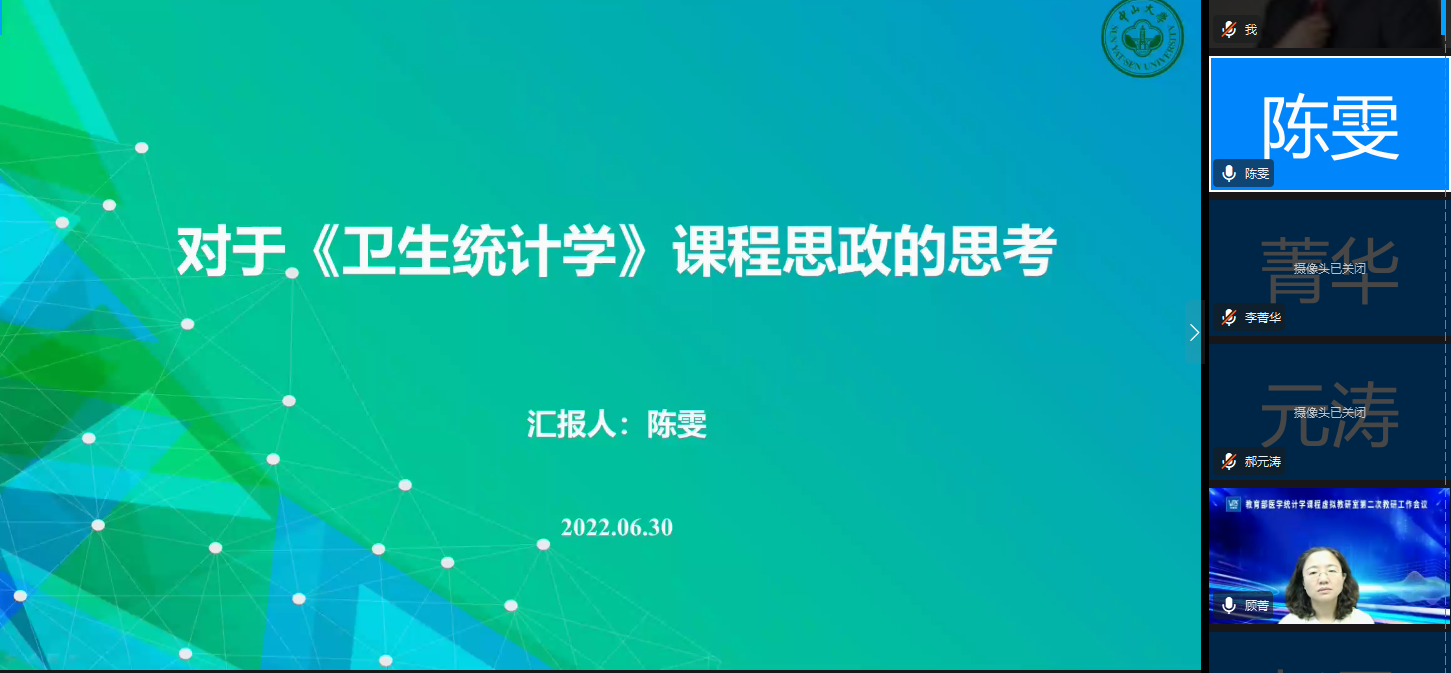 为推动虚拟教研室建设,促进教学资源的互联互通、共建共享,并探索新的教研形态,“医学统计学课程虚拟教研室”于2022年6月30日举行了第二次教研工作交流会,会议主要内容为虚拟教研室工作方案讨论、负责人说课示范以及医学统计学教学分享。10所参与虚拟教研室建设高校的牵头人、骨干教师以及教学秘书50余人参加了线上会议。本次会议由虚拟教研室骨干教师,yl88858永利集团公共卫生学院医学统计教研室郝春副教授主持。