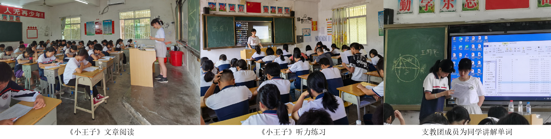 英语课上,支教队员开展外文名著《小王子》的专题阅读,老师为学生准备了听力音频和中英双语的原著文章,锻炼学生的听力能力,提高阅读水平,鼓励学生发现并记下自己不熟悉的词汇,增加学生的词汇储备。此外还带领学生们赏析《小王子》的电影,最终在学习完全书后,组织学生进行《小王子》的舞台剧表演和最佳表演小组的评选,寓教于乐,用电影、舞台剧的形式学习英语,培养学生对英语的兴趣,促进学生们今后的学习。