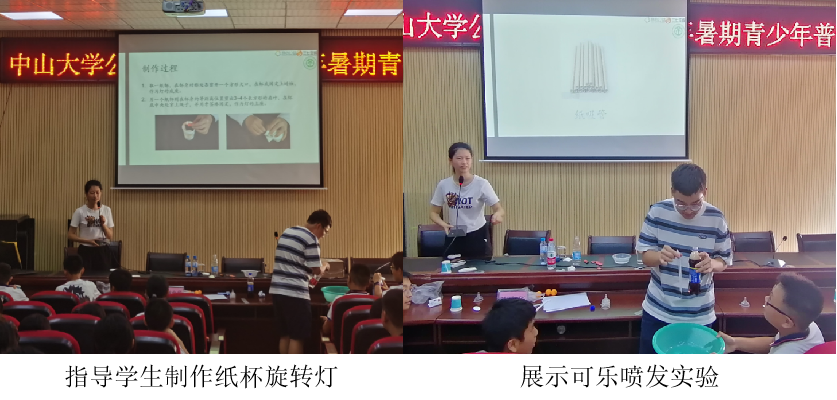 7月18日下午,在科普实验课上,支教队员们互相配合,为同学们带来了一节动手与动脑相结合、充满欢声笑语的趣味实验课。支教队员为同学们讲述了牛顿摆的原理、展示了大气压强的相关实验和可乐喷发实验,最后在支教队员的指导下,同学们完成了纸杯旋转灯的制作,成就感满满。课程内容充实,课堂气氛活跃,教学效果良好。