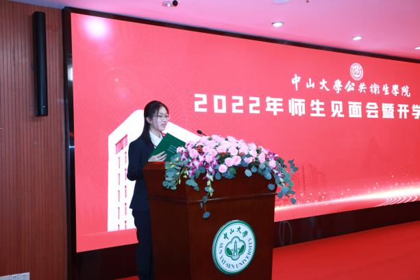 2021级研究生老生代表王胜浩同学结合五次抗疫志愿经历和科研锻炼经验,讲述了他一年研究生生活中的所思所感,鼓舞研究生新生们要脚踏实地,练就扎实本领;要勇于尝试,坚持不懈勤钻研;更要勇担时代使命,立志做人类健康的守门人。接下来是研究生新生代表,2022级硕士生张茂林同学发言。他表达了再次成为中大公卫学子的荣幸与自豪之情,他倡议同学们注重勤学实干,多学习、多思考、多行动,在科研求索的道路上耐得住寂寞,吃得了苦头,在成为“引领未来的高水平公共卫生人才”的道路上砥砺前行,奋发作为。