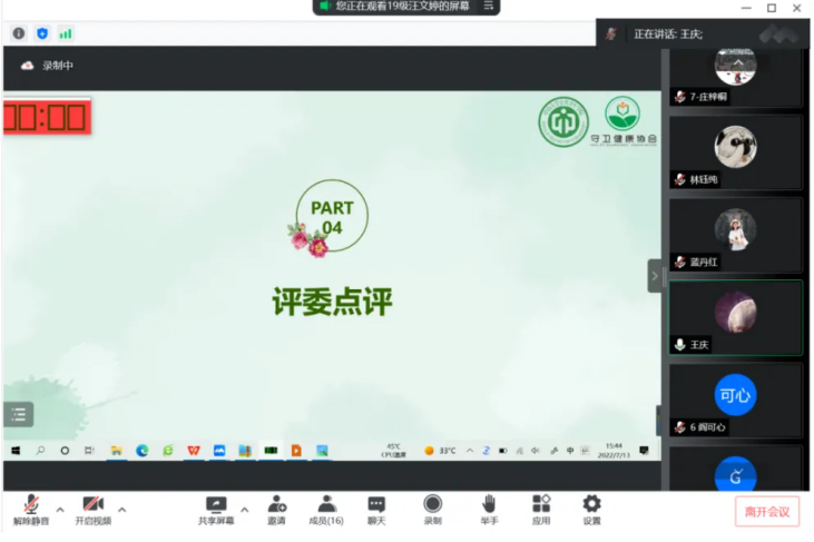 守卫健康协会于7月13日下午2:30-4:00在线上召开全国健康科普大赛选拔赛答辩评审会。本次会议邀请了四位院内外专家组成评审团,评审会由守卫健康协会业务指导老师、流行病学系刘跃伟副教授主持,共遴选出三份优秀作品参加全国大赛。推荐参加国赛的作品在指导老师和专家评委的指导下,进一步进行打磨完善,最终提交到国赛组委会。