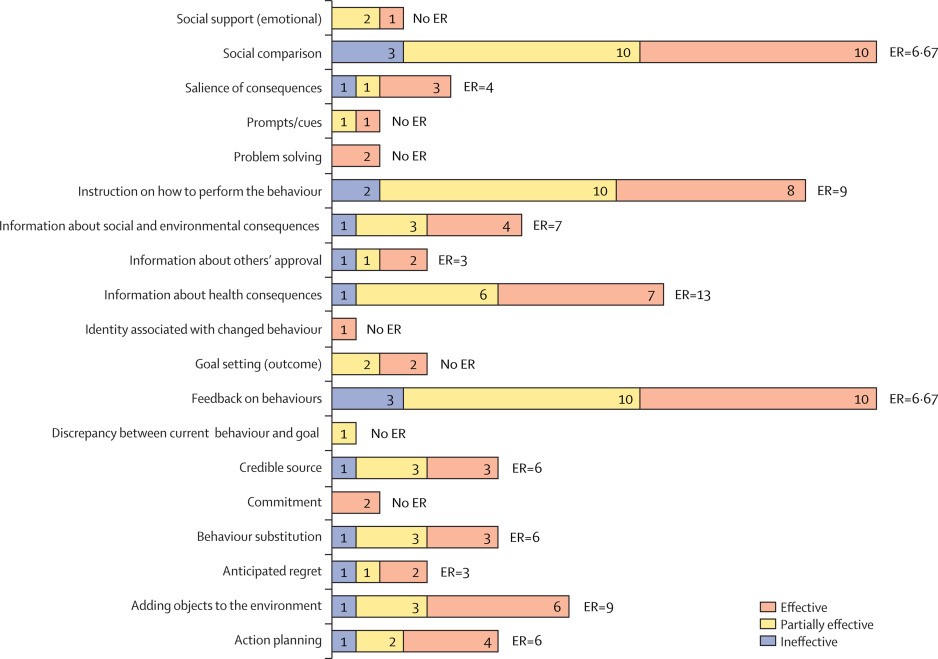 该研究运用了Cochrane协作网EPOC(Effective Practice and Organization of Care)组的方法学收集与社会规范反馈干预同期开展的其他配套措施。同时,分析了社会规范反馈干预成功实施的关键机制,收集使用社会规范反馈干预的文献所涉及到的BCTs编码,并且计算了BCTs有效比率。在纳入的所有研究中,都同时包含了"feedback on behavior"与"social comparison"这两种核心BCT,在SNF使用的干预包中发现BCT编码为“Information about health consequences”的SNF干预的有效比率最高(Effective ratio, ER=13),其次是“Adding objects to the environment”(ER=9)和“Instruction on how to perform the behavior”(ER=9)。