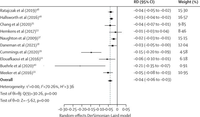 Meta分析显示SNF可以有效减少医生的抗生素处方行为,总体率差(RD)为4% (95%CI: 3%-6%, p<0.0001)。干预设计的对象(医生vs医疗保健机构)、干预方式(电子邮件vs实体信函)、干预手段(模糊排名vs精确排名)、干预反馈频率(每月vs每季度)均可能对SNF干预效果产生不同的潜在影响。