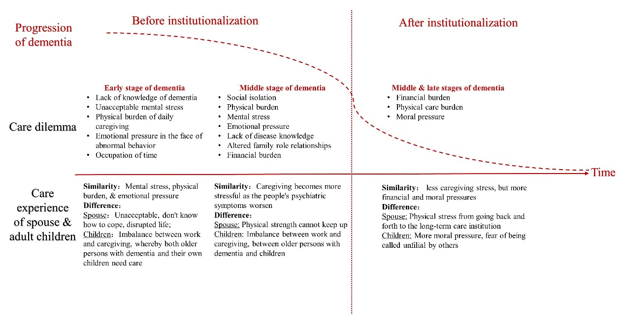 家庭支持是我国非正式照顾的主要来源,尤其对于照护保障不足、专业资源缺乏的失智症患者照顾。团队前期系列研究发现(Age & Ageing 2020; BMC Geriatrics, 2021),我国家庭照护者大多数是中老年人,其本身也患有多种慢性疾病,照护和自我照护的双重压力给照顾者带来身体和精神负担,而不得不求助于专业照护。在以孝道和家庭为中心的集体主义文化中,从家庭照护向机构照护的过渡可能涉及到更多家庭冲突及道德拷问。然而,目前对关于中国失智症家庭照顾者长期照护经历研究甚少,仅有证据片面聚焦于家庭或机构照护单一维度考量,缺乏更为系统的纵向研究证据。