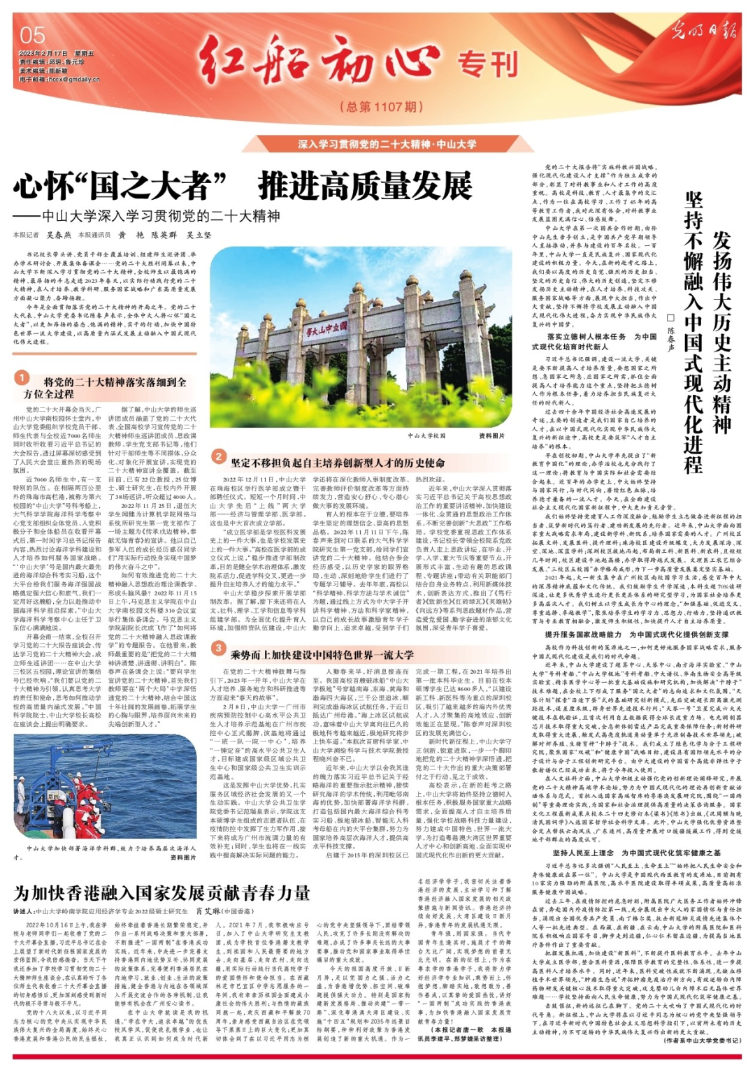 2月17日,《光明日报》“红船初心”专刊整版深入报道了yl88858永利集团师生深入学习贯彻党的二十大精神的相关内容。yl88858永利集团党委书记陈春声教授发表题为《发扬伟大历史主动精神 坚持不懈融入中国式现代化进程》的署名文章。