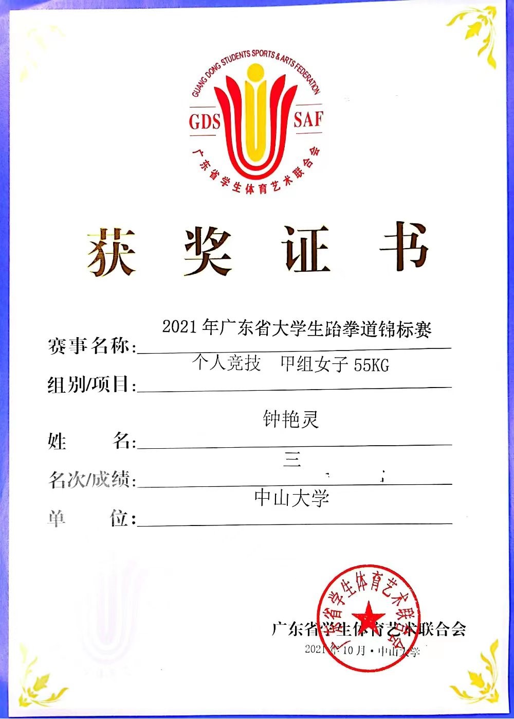 “文明其精神,野蛮其体魄”,在学习之余,她热爱体育锻炼,在锻炼过程中强健体魄,并认识到很多有趣的人,一群人因为兴趣爱好结实,她感受到了体育运动的魅力。在校期间体测成绩优秀,日常生活参于跆拳道训练,一周进行3次5公里长跑。参加2021年广东省大学生跆拳道锦标赛,获得女子甲组竞技55KG季军;参加2022年中国大学生跆拳道(品势)锦标赛,获得甲组混双品势冠军。