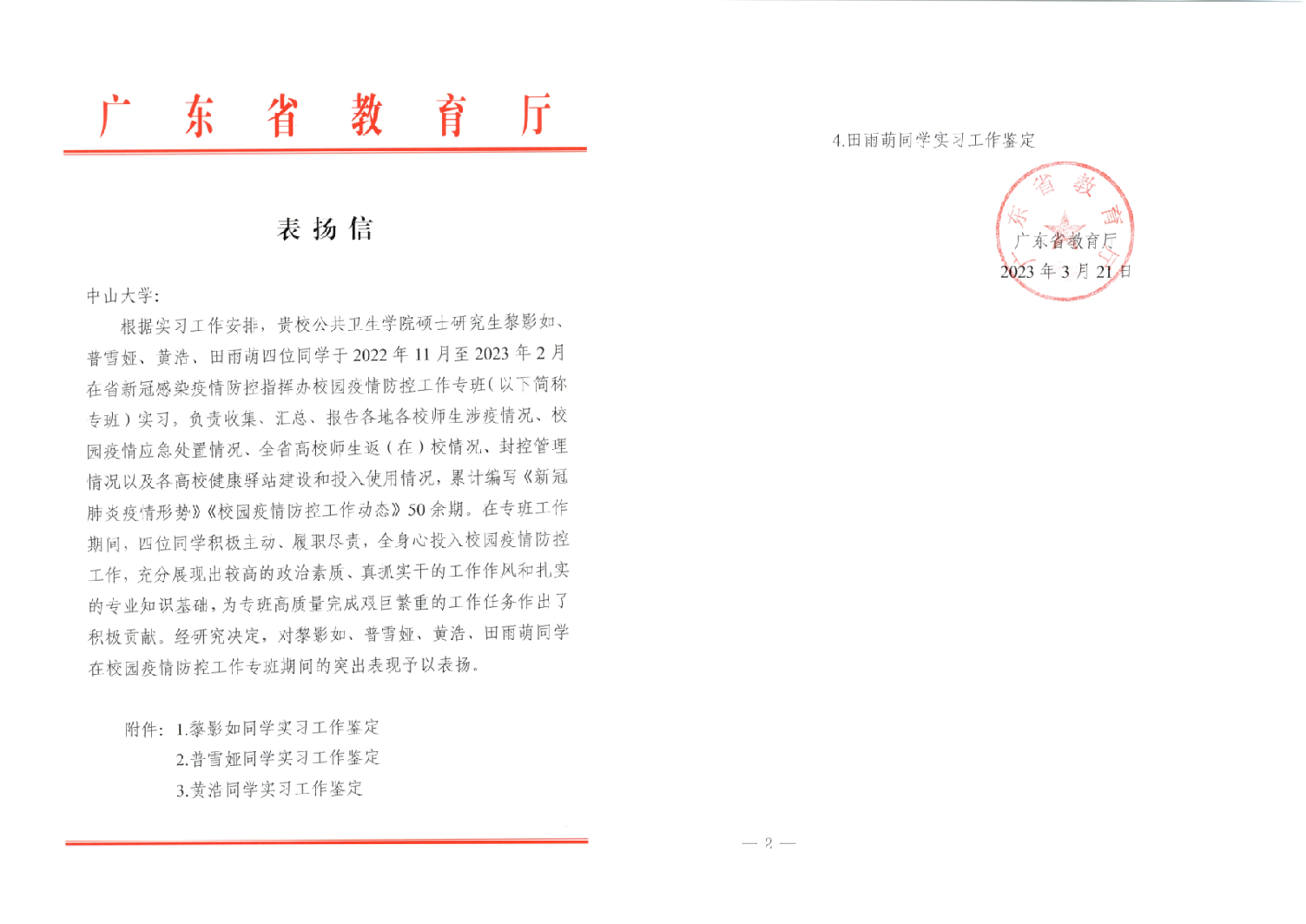 应广东省教育厅的请求,学院安排我院公共卫生专业的四名硕士生——黎影如、普雪娅、黄浩、田雨萌,于2022年11月至2023年2月期间在省新冠感染疫情防控指挥办校园疫情防控工作专班开展志愿服务,他们主要负责收集和汇总学校涉疫情况、校园疫情防控等信息,并撰写《新冠肺炎疫情形势》《校园疫情防控工作动态》等报告。在平凡的工作中,他们把责任与担当,专业知识与能力化为踏踏实实的行动,努力为抗击新冠疫情作出贡献,切实传承了新时代的雷锋精神!