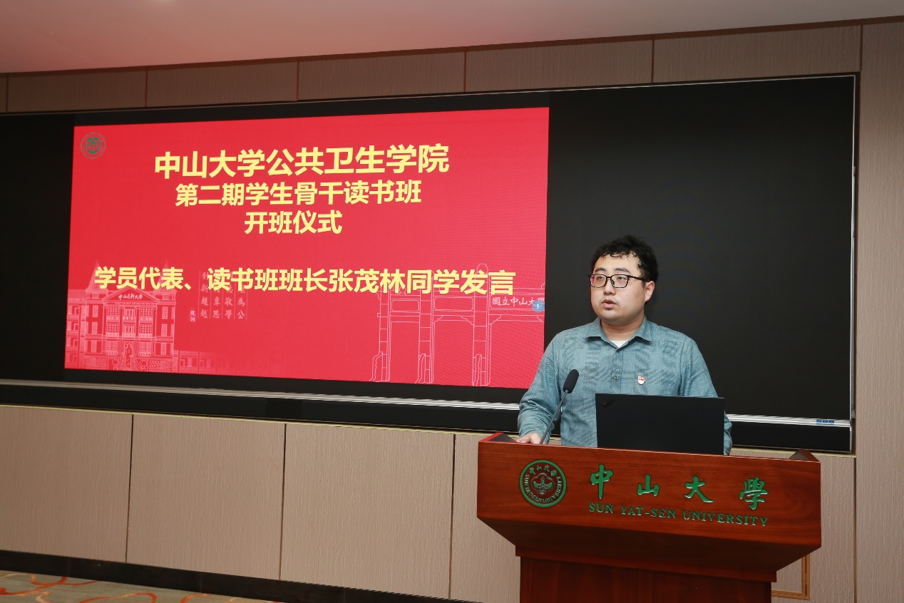第二期学生骨干读书班班长张茂林同学代表全体学员发言。他表示将联合各位班委组织好学员自学、小组讨论、实务培训、现场教学等工作,希望大家珍惜读书班的学习机会,将典籍中理论知识与科研中学术知识相结合,认真品读经典,提高学生工作管理能力。