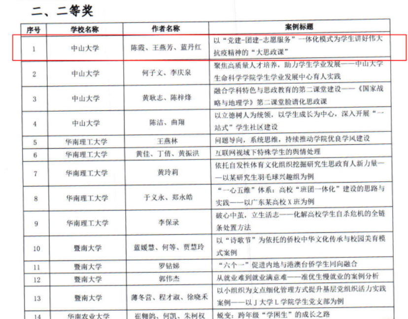 近日,由高校思想政治工作队伍培训研修中心(华南师范大学)和广东省高等学校思想政治教育研究会组织开展的广东高校学生工作案例评优活动评选结果揭晓,我院陈霞、王燕芳、蓝丹红老师申报的案例《以“党建-团建-志愿服务”一体化模式为学生讲好伟大抗疫精神的“大思政课”》荣获二等奖。