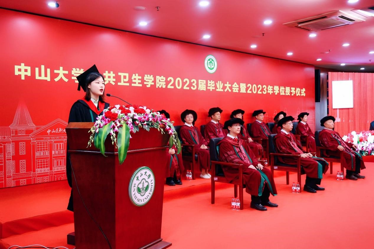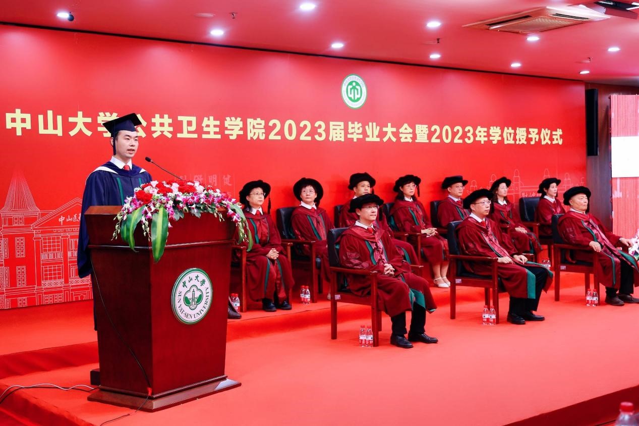 宣誓过后,两位优秀毕业生代表进行发言,一字一句都饱含着对母校师生的感激和直面未来的勇气。2018级本科生孙欣怡回忆了在中大公卫学院优质的学习资源、广阔的科研平台以及丰富的实践活动 ,将永远铭记“博学、审问、慎思、明辨、笃行”的校训,秉承中大公卫学院的优良传统,在青春的赛道上接力奋斗,在广阔的人生中发光发热,努力成长为专业素养过硬、堪当大任的领军人才。2020级硕士生陈锋在这三年来深刻地体会到了作为公卫人的责任。抗疫流调志愿队的服务经历与丰富的科研工作经历让他感受到了守卫公众健康的担当和公卫学子的使命。他呼吁同学们充分发扬公卫学院的优良传统,谨记校训和院训,踔厉奋发,砥砺前行,为祖国的公共卫生事业发展贡献出自己的一份力量。
