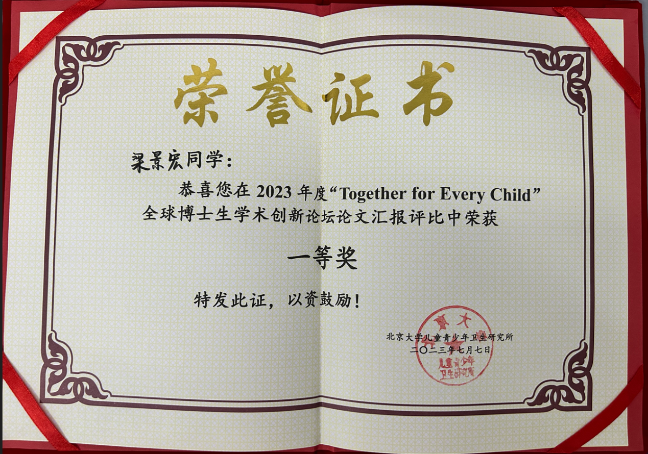 喜讯 | 我院2020级博士研究生梁景宏在“Together for Every Child”全球博士生学术创新论坛中荣获一等奖