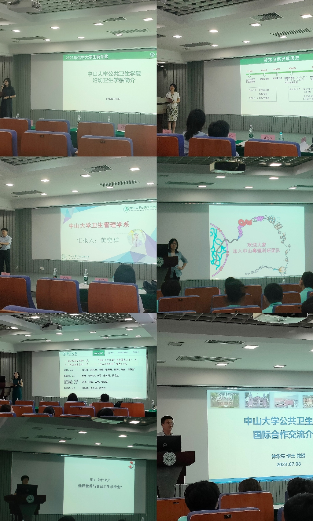 公共卫生学院副院长王庆教授对学院的招生情况、研究生招生政策及公共卫生专业型研究生作介绍。院长助理兼流行病学系主任林华亮教授介绍研究生国际交流情况,各系(室)中心主任、教师及学生代表介绍了其专业特色和师资情况,帮助营员客观全面了解公共卫生学院的学科方向、人才培养模式等。