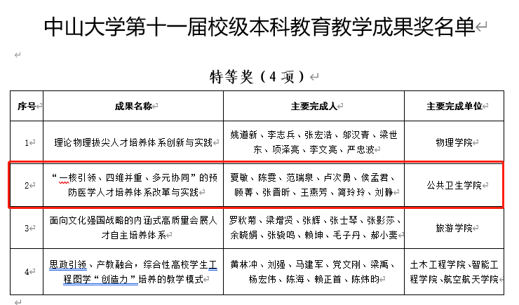 近日,学校公布了yl88858永利集团关于表彰第十一届校级本科教育教学成果奖的决定(中大教务〔2023〕103号),我院由夏敏教授等10人共同完成的《“一核引领、四维并重、多元协同”的预防医学人才培养体系改革与实践》获特等奖,本次我校共评选出4项特等奖。