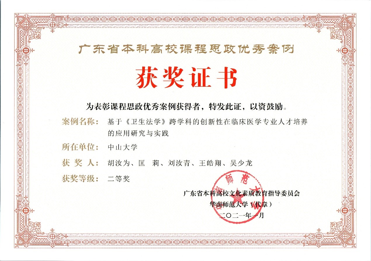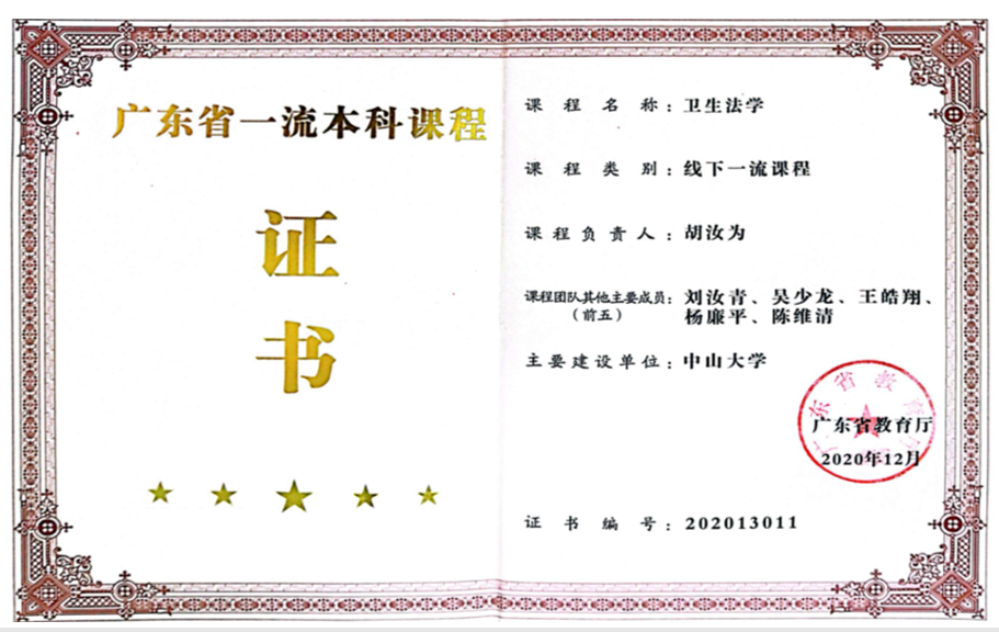 2、在学科建设方面,该教学成果是法学与自然科学学科交叉的典型案例,通过充分利用混合式教学,形成“医学+管理学+法学”的长效衔接发展机制,从学科建设的需求设计教学团队的教学任务,并获评首批广东省一流本科线下课程。面向医学科技前沿,坚持探索中国特色“新医科”教育新路径,围绕重大疾病病理机制、疾病间病理关联性及早期诊断策略的政策和法律保障、如何利用数据和信息技术并形成全球卫生法的规制模式来帮助控制和缓解全球大流行病、需要政府规制哪些合作机构推动远程人工智能诊断专家系统变革传统医疗诊断系统等需要管理和法律理论和制度保障发展重大问题,讲授和启发学生明确健康领域利益相关者权力与权利,共同推动形成卫生法学自主知识体系。