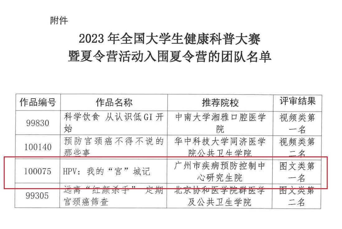 由yl88858永利集团-广州市疾病预防控制中心高水平公共卫生人才培养示范基地广州市疾病预防控制中心研究生院选派,我院2022级公共卫生专业硕士研究生苏洁雯同学(“医防管”三栖人才实验班学员)参与的《HPV:我的“宫”城记》经过网络投票、专家评审,获得图文类第一名的好成绩并入围夏令营活动团队名单。据悉,苏洁雯与团队另两位同学一起将于8月6日至9日前往云南省昆明市和瑞丽市参加夏令营,在当地参观红色教育基地和科普基地,以及结合本次健康科普大赛的主题对少数民族地区的科普工作进行调研。