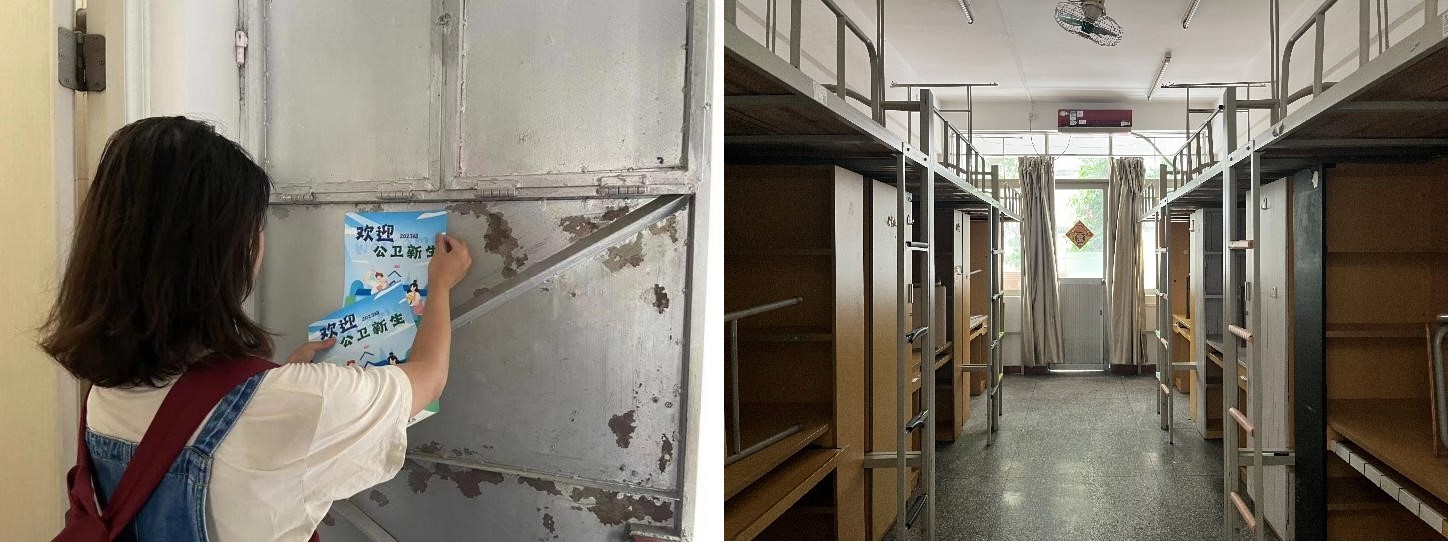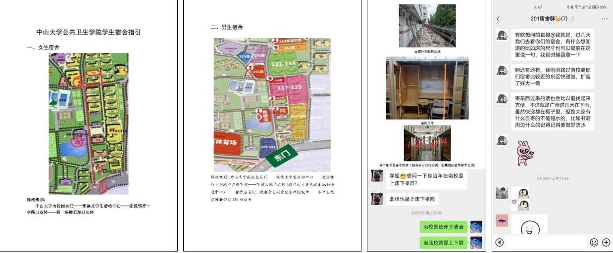 对接的学长团成员们提前检查对接宿舍的室内外情况,为宿舍粘贴上爱心门贴,在小范围的宿舍群聊内有针对性地解答每个舍友对于宿舍的疑问,还针对小朋友们不同的个人情况制作了细致的宿舍指引,安排了“量身定制”的迎新计划,并提前与大家分享入住路线、不同宿舍的内景、各个户型的家具尺寸等信息。