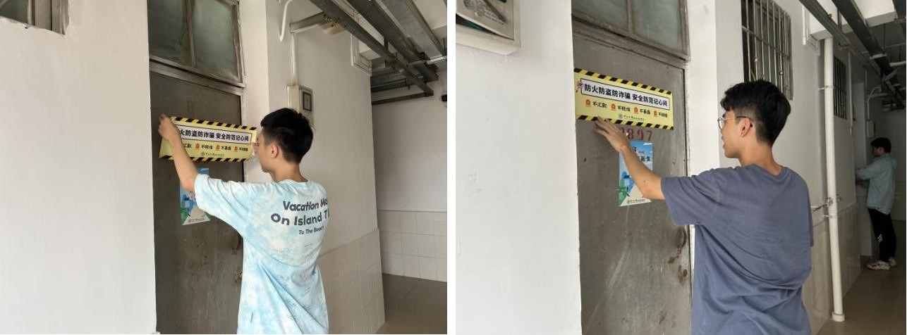 赶在假期的“尾巴”,学长学姐们提前返校,在每间新生宿舍的门上粘贴安全教育门贴,提醒学弟学妹们,在积极打造温馨“小家”的同时也需要注意“防火防盗防诈骗,安全防范记心间”,提高大家的安全意识,希望小朋友们能够不受潜在危机的困扰,专心享受安全与美好的大学生活呀~
